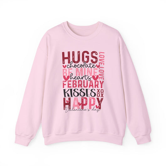 Soft, cozy, and quietly festive — this crewneck wraps you in gentle comfort while celebrating love and warm moments. The white sweatshirt features a vertical block of playful, hand-lettered words in rosy tones: HUGS, BE MINE, KISSES, FEBRUARY, and HAPPY, accented with tiny hearts and love-themed script. Wear it on chilly mornings with jeans and boots, or keep it on while sipping cocoa by twinkling lights. The relaxed classic fit and crew neckline make it easy to layer, while durable double-needle stitching keeps it looking neat after many washes. This piece feels like a small, wearable note of affection — casual, cheerful, and made to be lived in during cozy date nights, galentine gatherings, or slow weekend mornings.