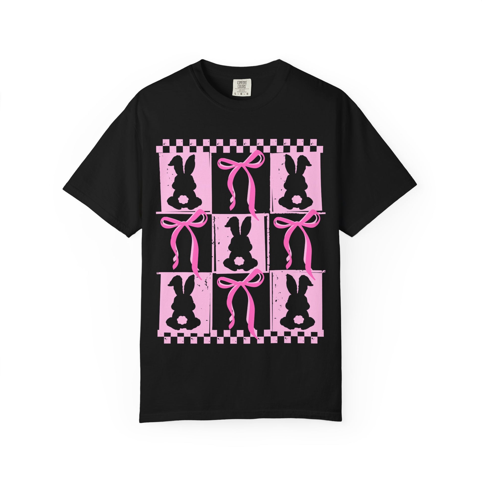 Soft, relaxed, and a little bit playful — this garment-dyed tee brings a cozy, vintage-ready vibe to your everyday wardrobe. Lightweight but substantial, the heavyweight cotton feels broken-in from day one thanks to post-construction dyeing that gives each shirt a softly faded, lived-in texture. The front art features a checkerboard of pastel bunnies and ribbon bows in pink tones, a sweet nod to nostalgic motifs and cottagecore aesthetics. Wear it on slow weekend mornings with worn denim, layer it under a cardigan for an afternoon market run, or bring it to an outdoor picnic when you want to feel comfortable and cheerful. Built to last with double-needle stitching and a tubular knit that sits clean and smooth, this tee ages beautifully — the color and soft hand only deepen with wear.