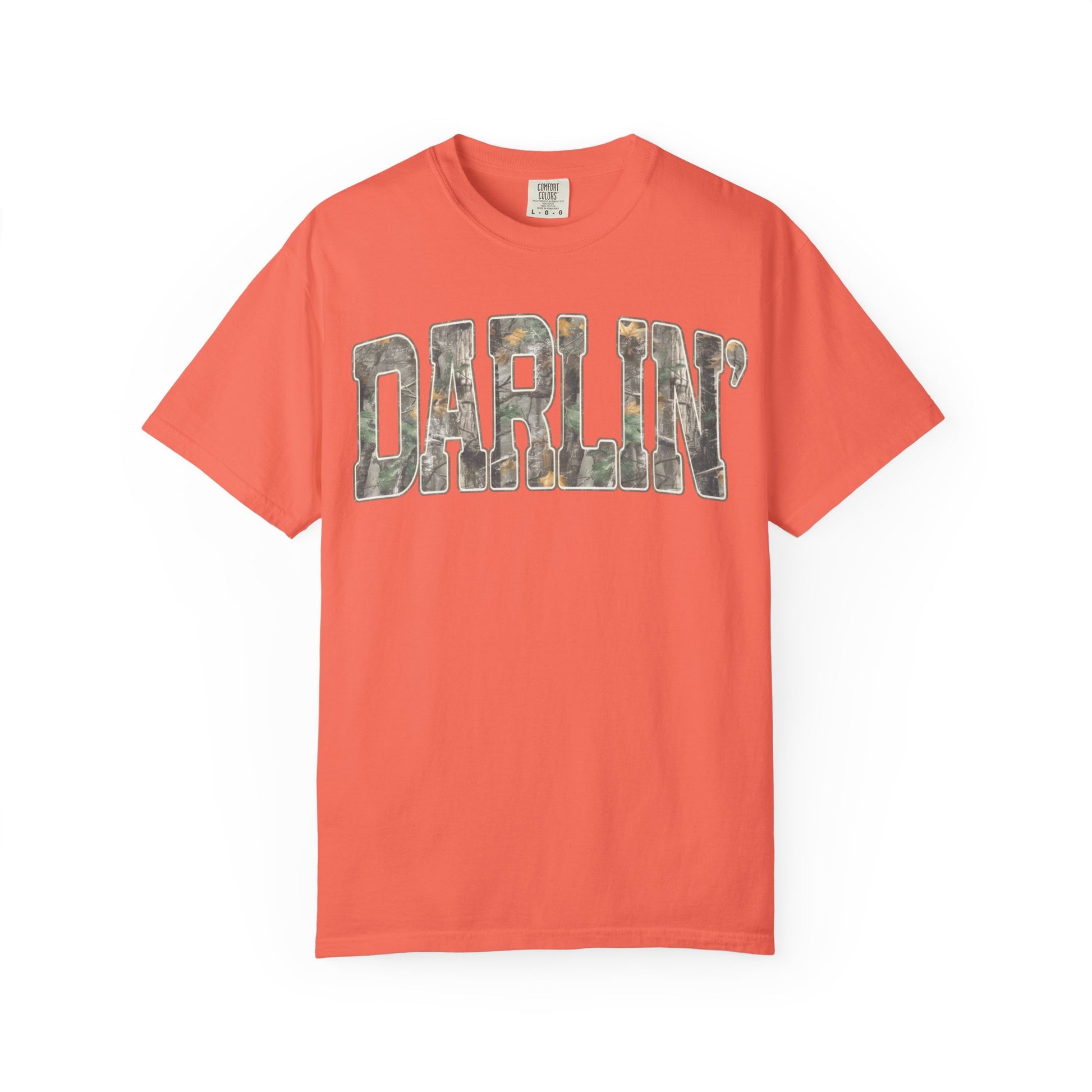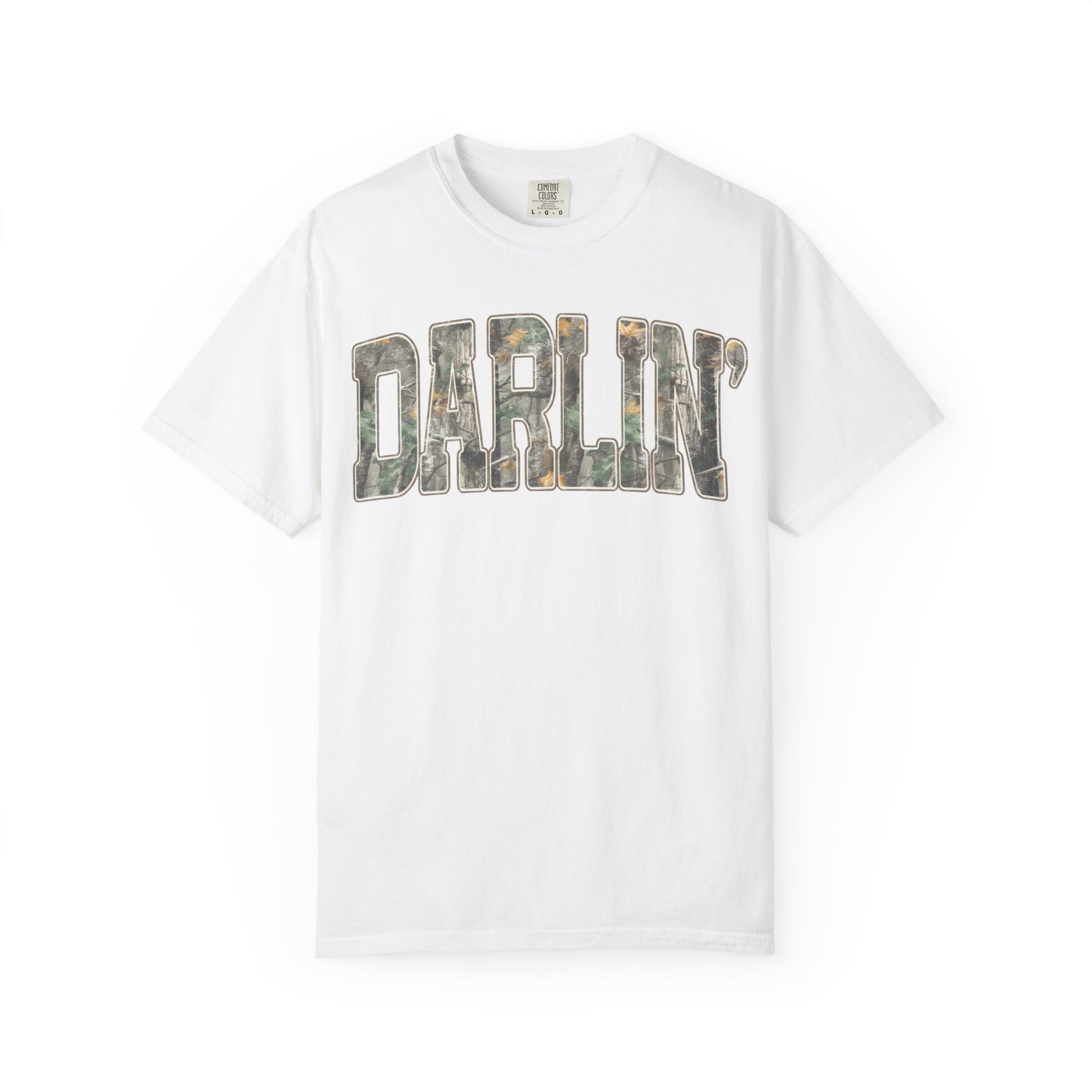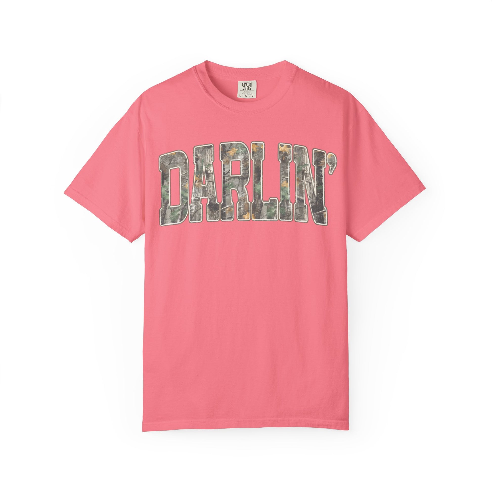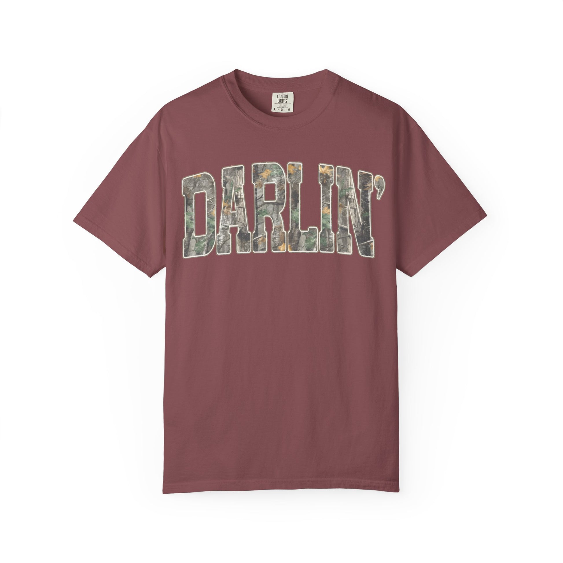 Soft, lived-in, and quietly bold — this garment-dyed tee carries a laid-back confidence. The heavyweight 100% ring-spun cotton gently breaks in over time so the shirt becomes uniquely yours. A camo-style “DARLIN’” across the chest adds a touch of rugged charm without shouting; it sits naturally with jeans, a worn jacket, or layered under flannel for chill evenings. The relaxed fit and tubular construction make it comfortable for long days outdoors or slow coffee mornings at home. Expect subtle color depth from the post-construction dyeing and durable double-needle stitching that holds up after repeated wear and washes.