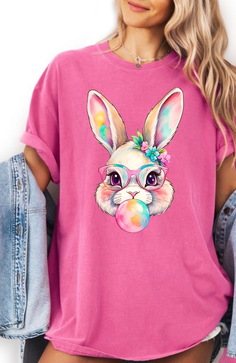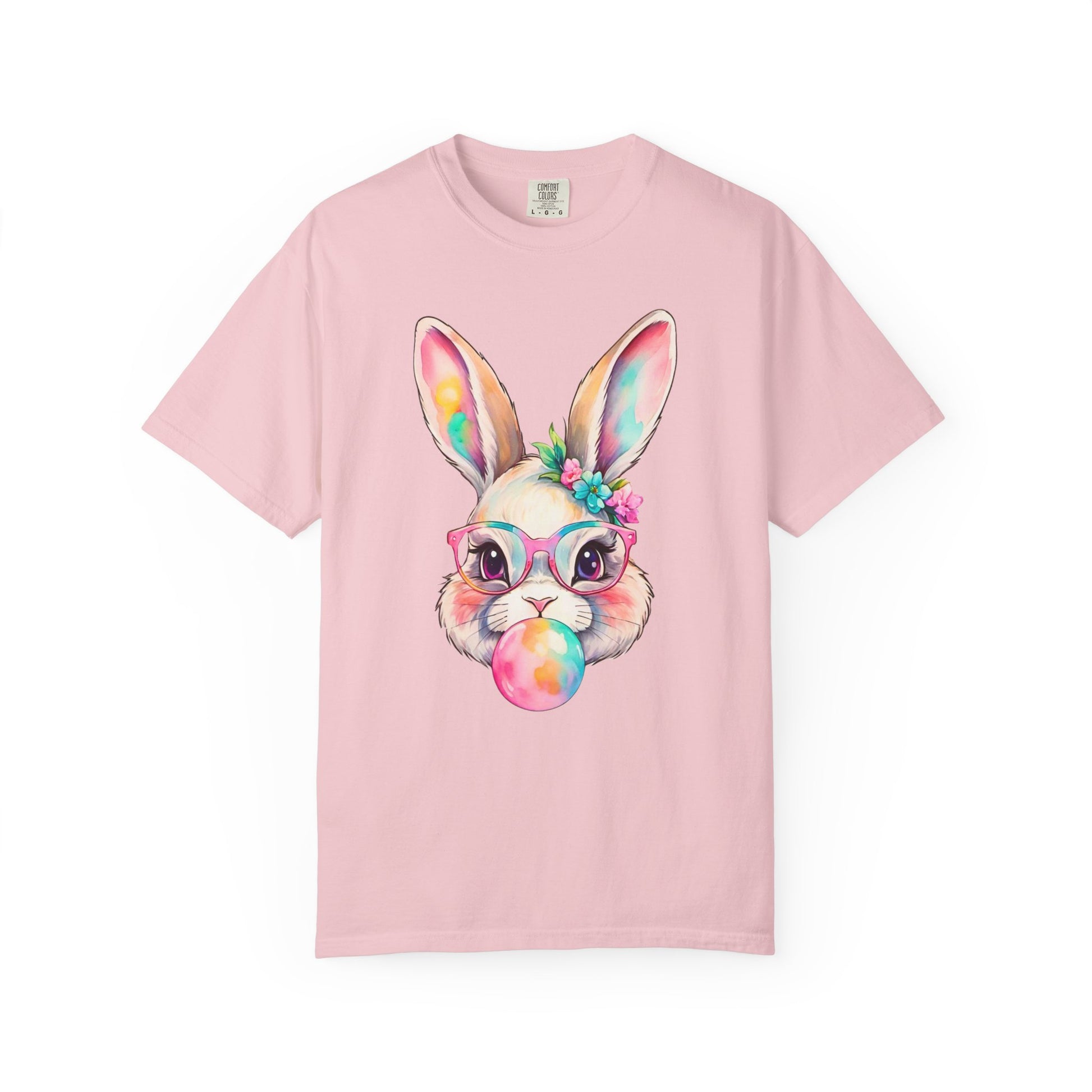 Light, charming, and a little bit mischievous—this garment-dyed cotton tee carries a watercolor bunny blowing a pastel bubblegum pop. The relaxed, heavyweight knit has a soft, lived-in feel from the post-construction dyeing, so the bright illustration sits on a cozy, textured canvas that gets better with every wash. Wear it to lazy spring mornings, backyard egg hunts, or strolls through the farmers’ market; the playful rabbit design adds color and personality without shouting. The roomy cut and durable double-stitched seams mean you can move freely while the printed art stays vibrant against the soft, slightly vintage wash of the fabric.