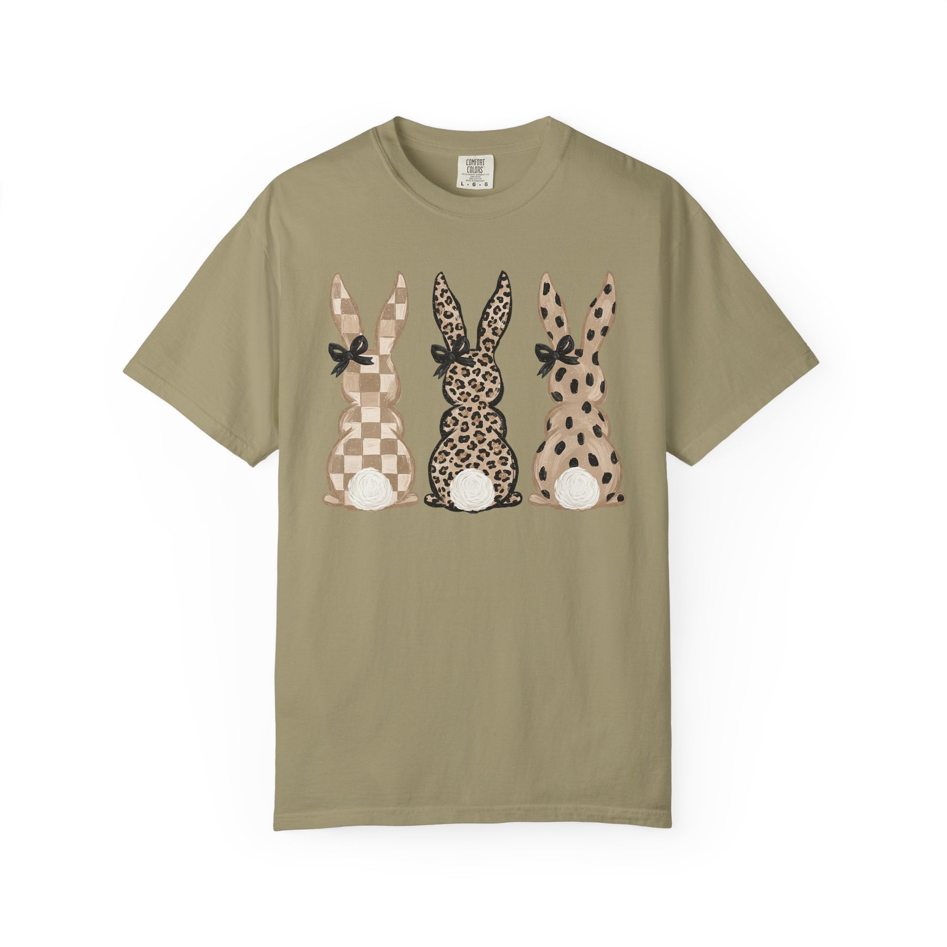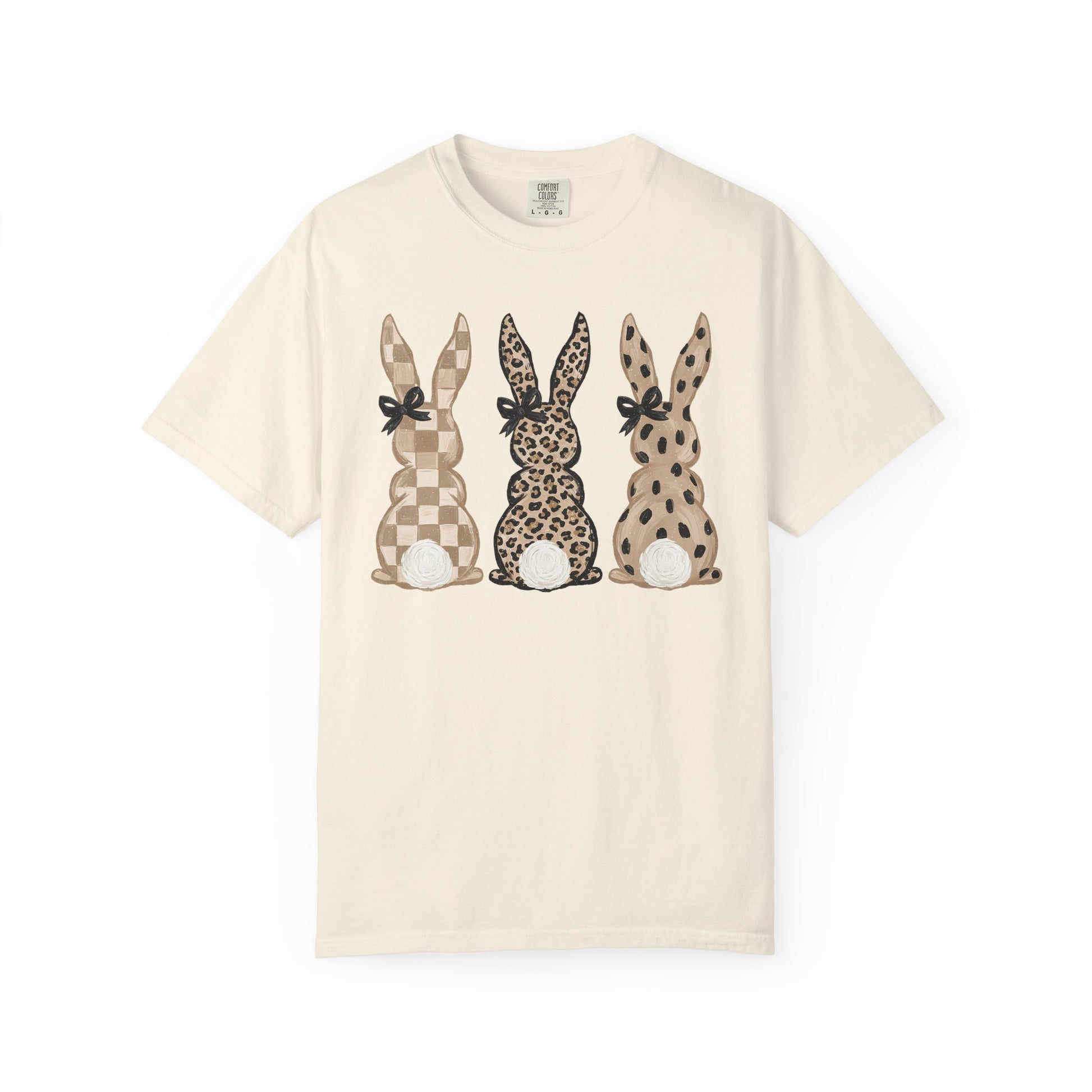 A soft, garment-dyed tee that feels lived-in from the first wear, featuring three whimsical bunny silhouettes in warm neutral patterns — checks, leopard, and polka dots — each with a tiny bow and fluffy tail. Lightweight yet substantial, the relaxed fit and heavyweight cotton drape comfortably whether you’re cozying up at home, running errands, or gathering for a casual spring brunch. The muted, washed color and stitched details give it a handcrafted, cottage-core vibe that pairs easily with jeans, linen skirts, or an oversized cardigan. This shirt is for people who love gentle, nature-inspired designs and quiet, everyday charm.
