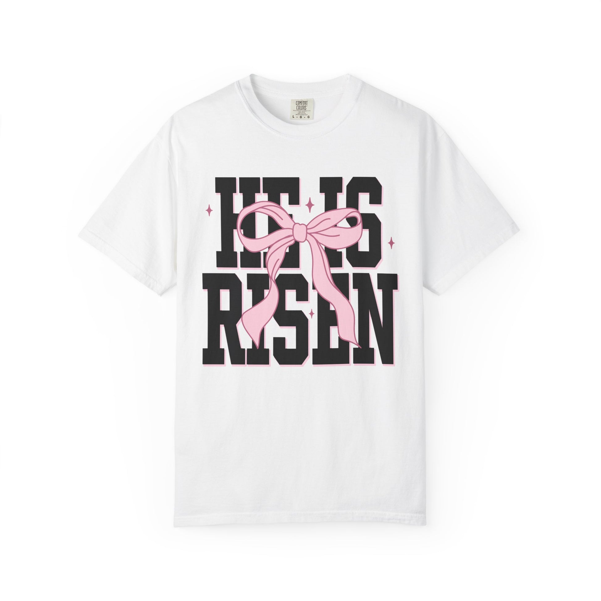Lightweight yet substantial, this garment-dyed tee brings gentle texture and quiet confidence to your everyday wardrobe. Bold block letters read HE IS RISEN, softened by a hand-drawn pink bow and tiny sparkles — a balance of strength and tenderness. Wear it to Sunday gatherings, spring outings, or low-key celebrations when you want a piece that speaks faith and joy without shouting. The relaxed fit and washed-in color feel lived-in from day one, layering easily under jackets or standing alone with jeans. It’s the kind of shirt that becomes a familiar companion on mornings that need a little reminder of hope.