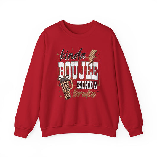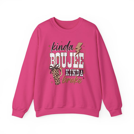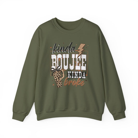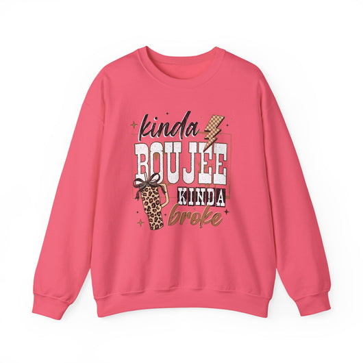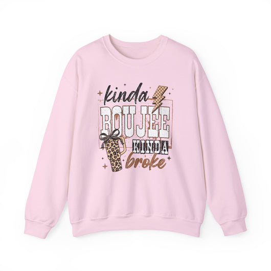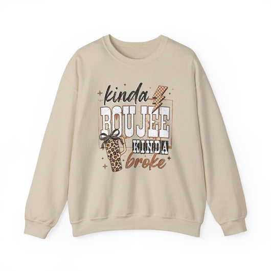 Soft, cozy, and unapologetically playful — this sweatshirt says ‘kinda boujee, kinda broke’ with hand-drawn flair. The medium-heavy 50/50 cotton–poly blend holds shape and warmth while the classic crew cut and ribbed collar keep the look clean and easy to layer. Leopard print accents, sparkles, and a lightning motif give it personality without shouting. Wear it on slow mornings with coffee, on errands when you want a little sass, or layered for movie nights with friends. It settles comfortably into everyday life: a confident, tongue-in-cheek piece that reads luxe at a glance but feels like your go-to cozy layer.