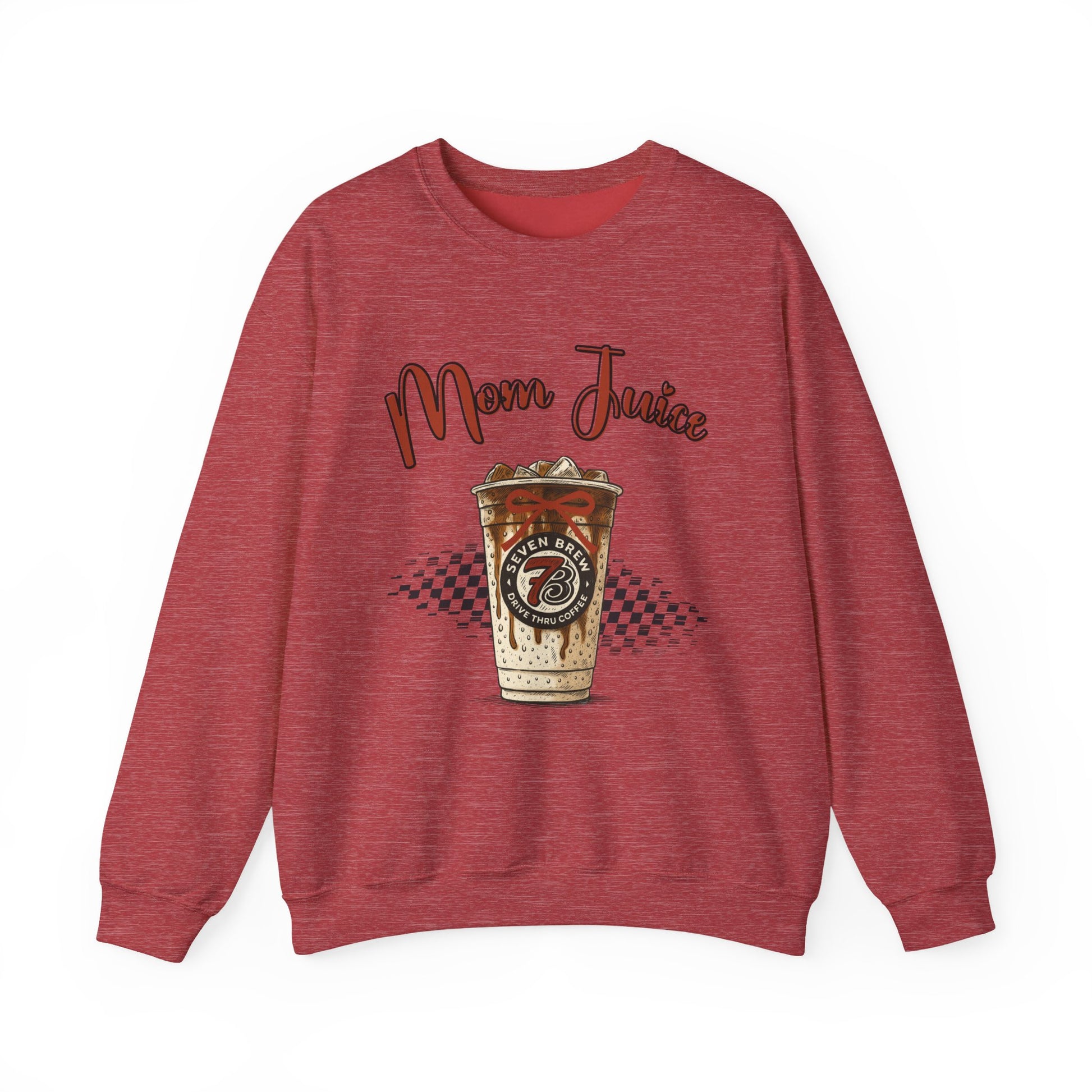 This cozy crewneck carries a warm, slightly cheeky vibe — a lived-in sweatshirt that feels like a slow morning at the coffee shop. The front shows a stylized iced coffee cup with the words “Mom Juice” in hand-lettered script, set against a subtle checkerboard accent. It’s the kind of sweatshirt you pull on when errands, school drop-offs, or a quick stroll demand comfort and a little attitude. Soft against the skin, structured at the collar, and built to keep its shape after many washes, it blends everyday wearability with a touch of playful personality.