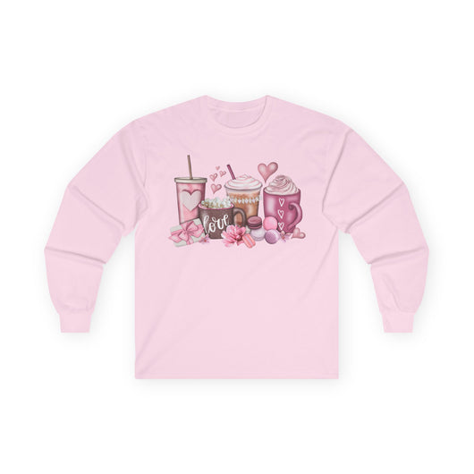 Soft and slightly vintage-feeling long sleeve printed tee that brings a cozy, sweet-cafe vibe to everyday wear. The front art shows an arrangement of pink drinks, pastries, and little hearts — the sort of illustration that makes you think of slow afternoons at a pastry counter, spilled sugar on a wooden table, and warm conversations over frothy lattes. The medium-weight cotton holds print detail well and the ribbed collar and shoulder taping keep the silhouette tidy after many washes. Wear it layered under a denim jacket for crisp mornings, or alone on a cool evening when you want something comfortable and charming that still reads thoughtful and intentional.